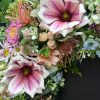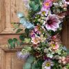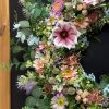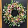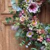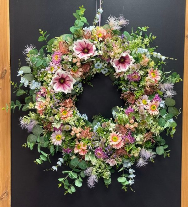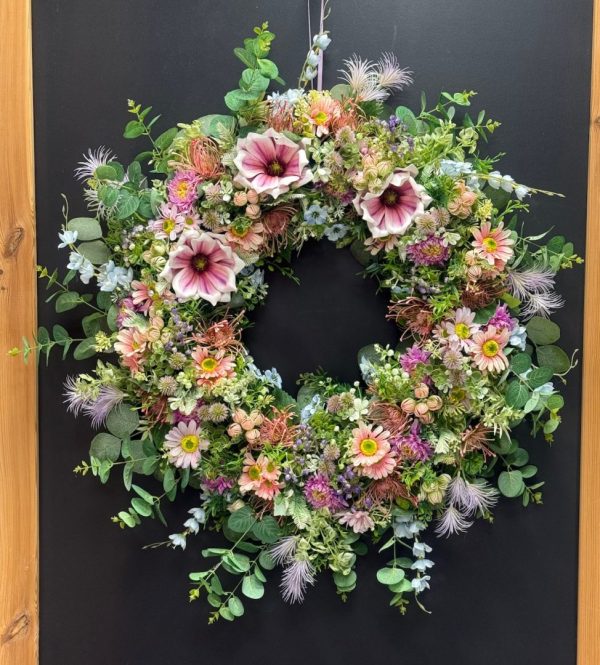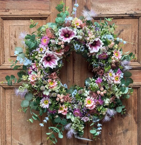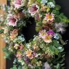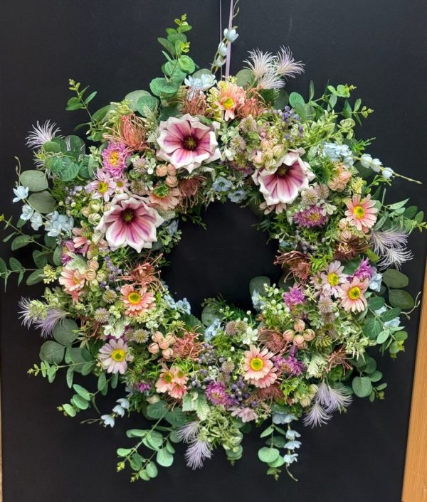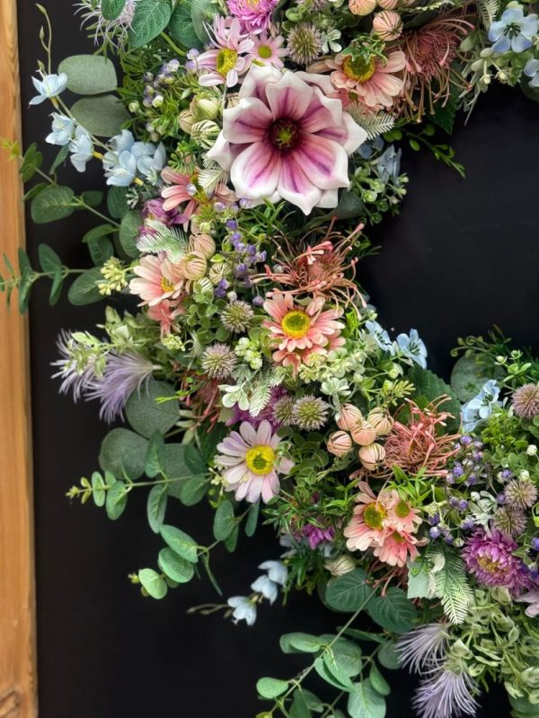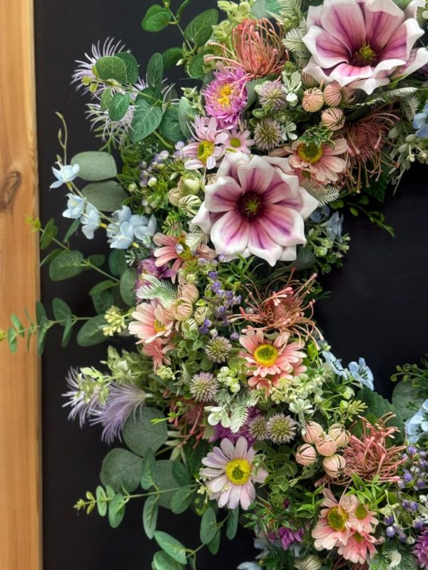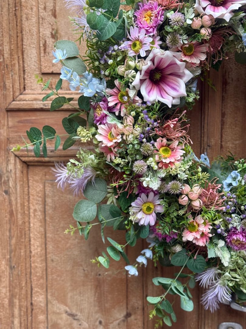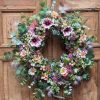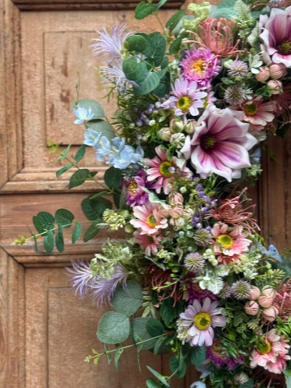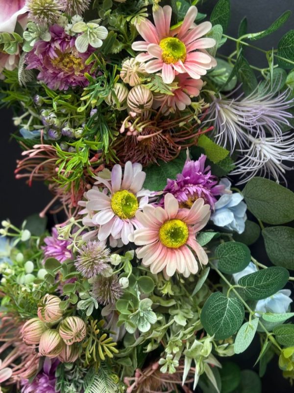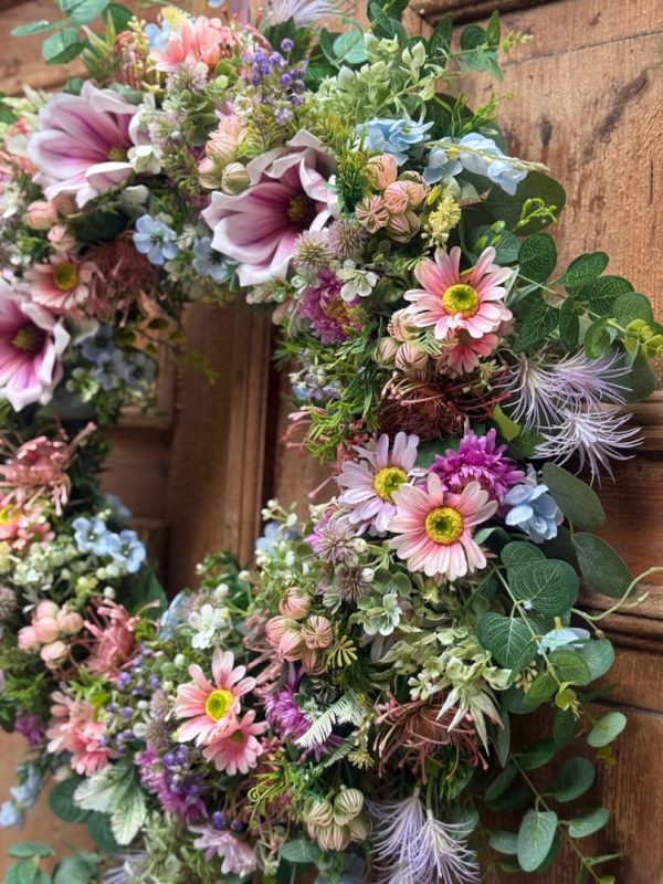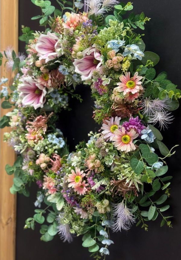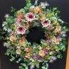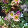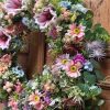 Wianek wykonany w całości ze sztucznych kwiatów i dodatków na faszynowym wianku.