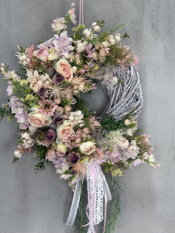 Wianek wykonany w całości ze sztucznych kwiatów i dodatków.