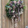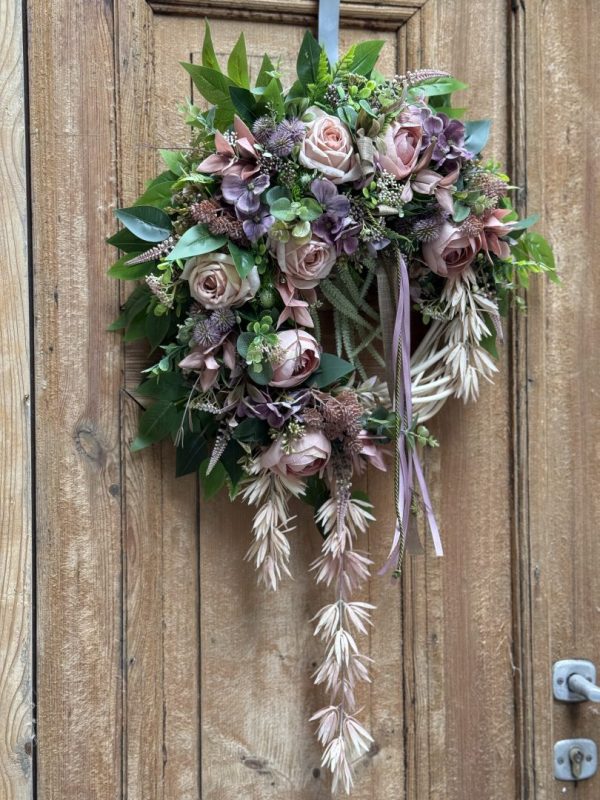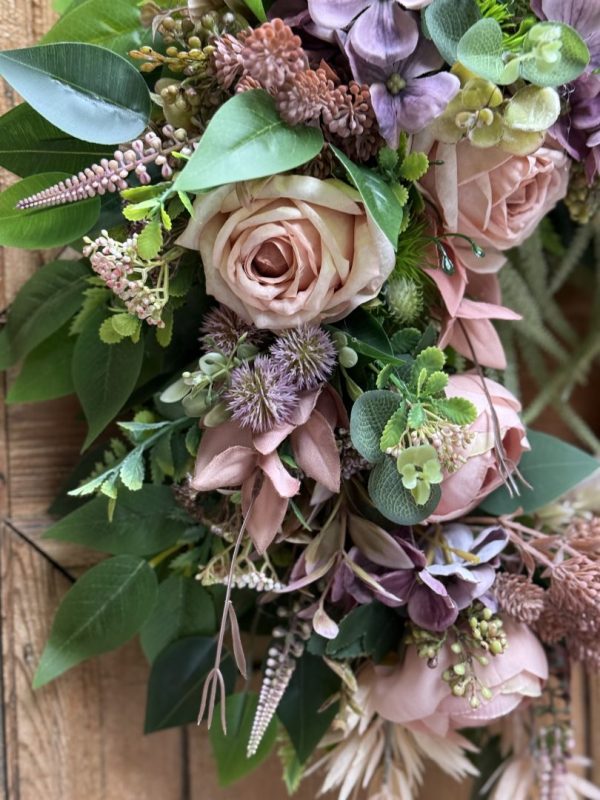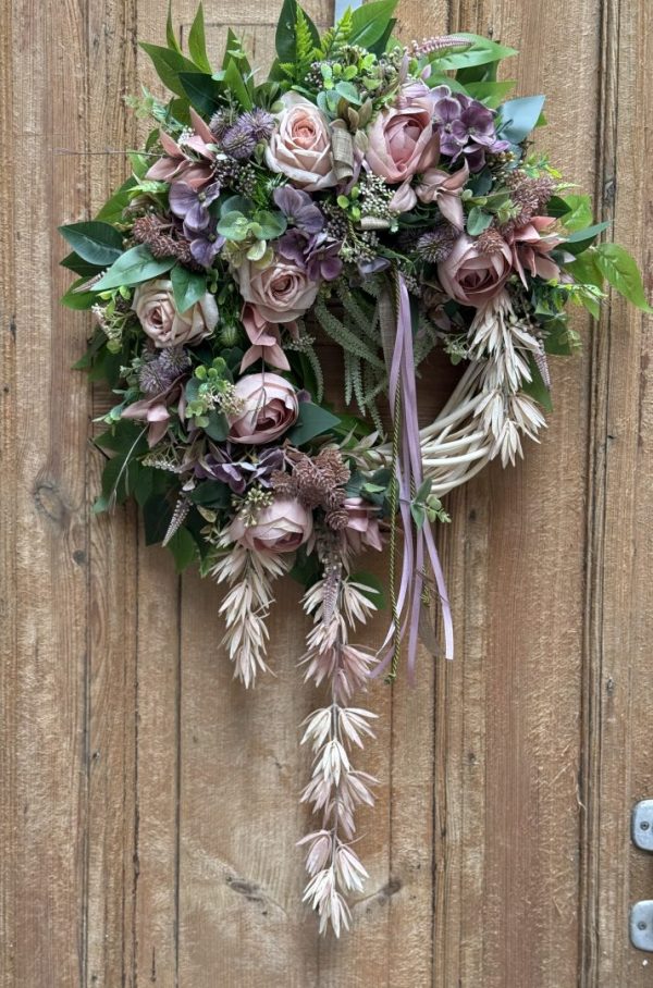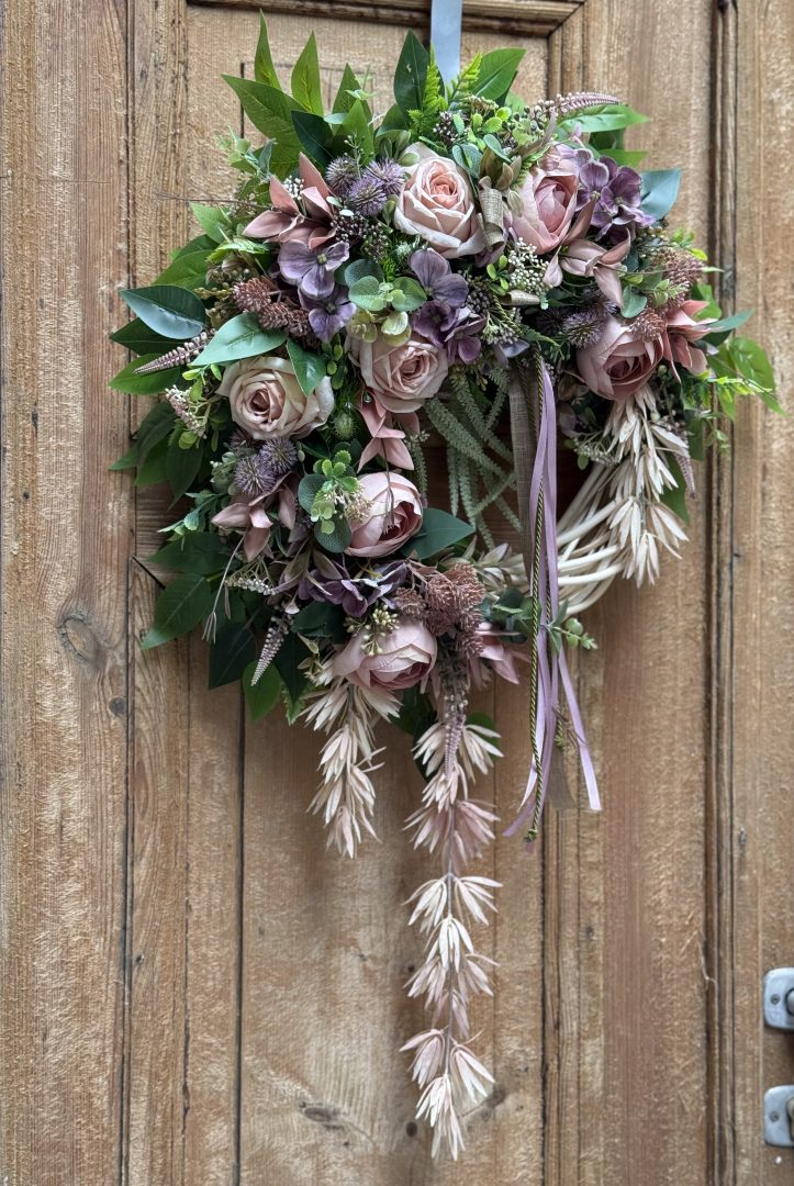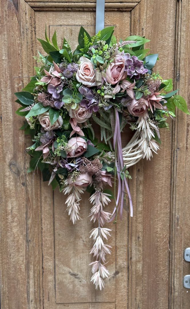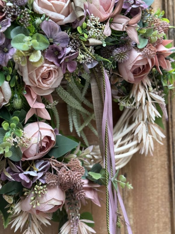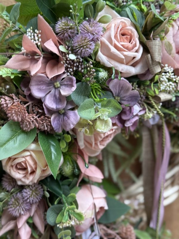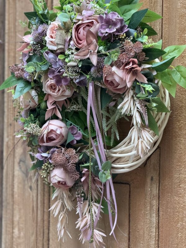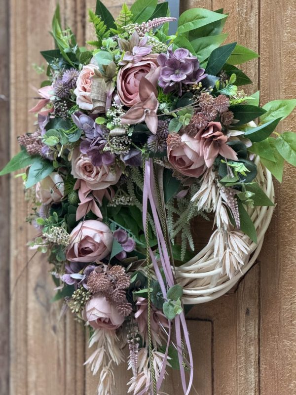 Wianek wykonany w całości ze sztucznych kwiatów i dodatków.