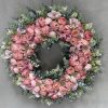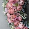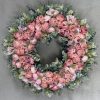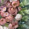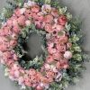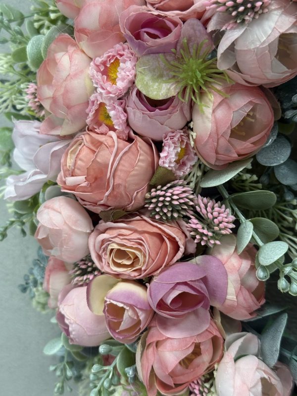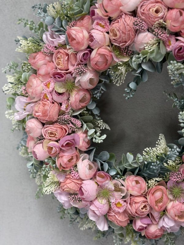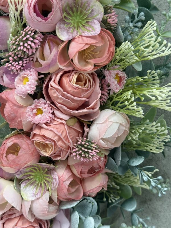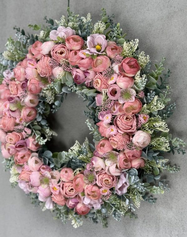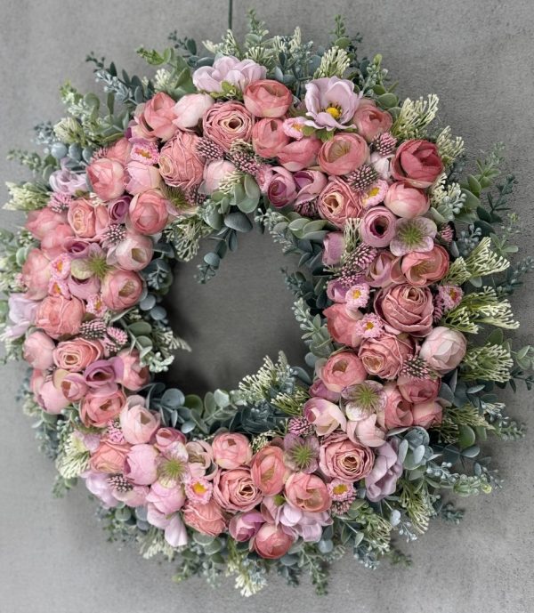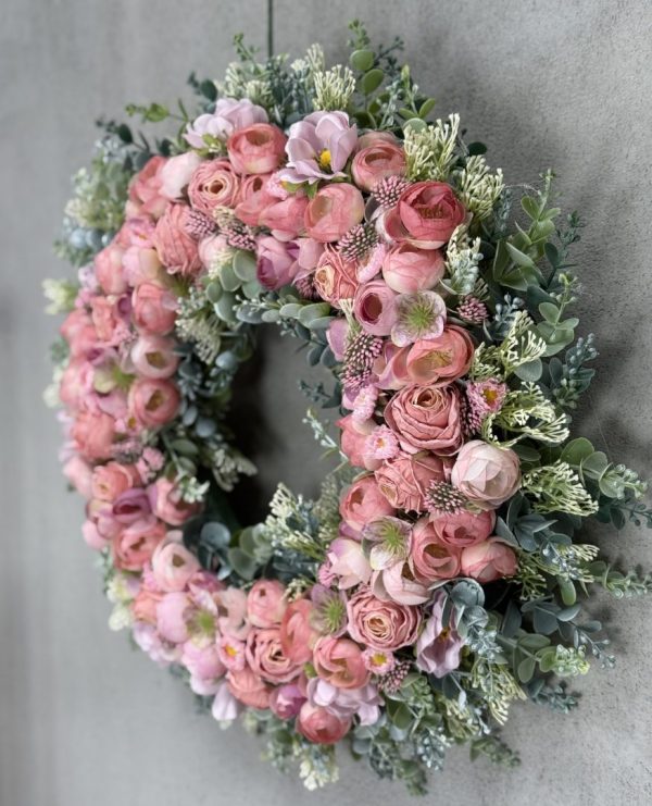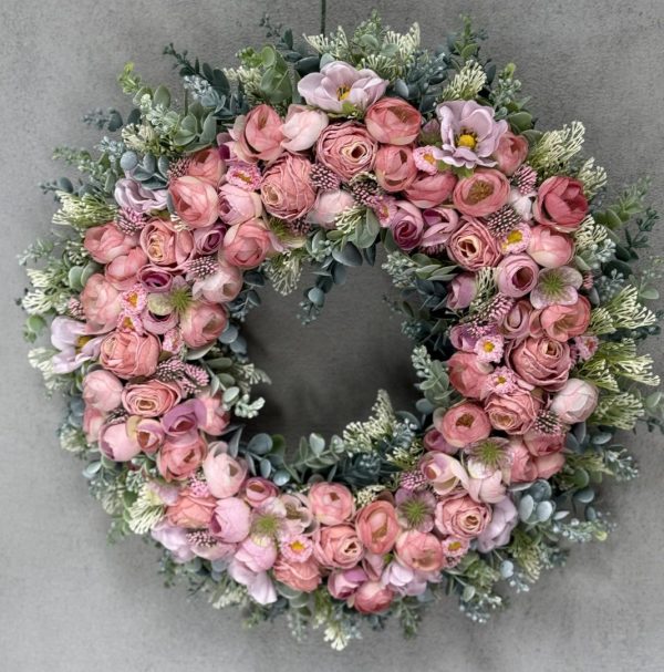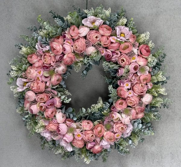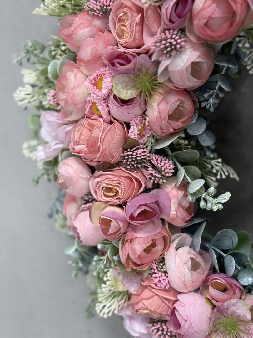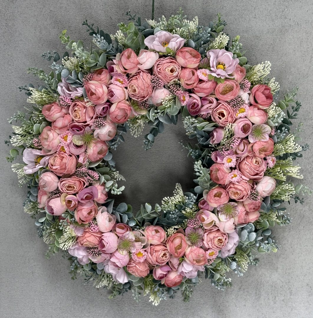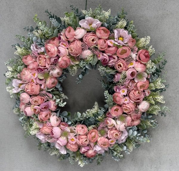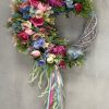 Wianek wykonany w całości ze sztucznych kwiatów i dodatków.