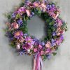 Wianek wykonany w całości ze sztucznych kwiatów i dodatków na metalowej obręczy.