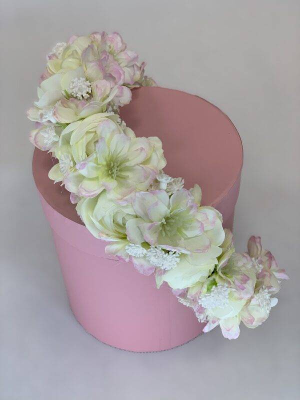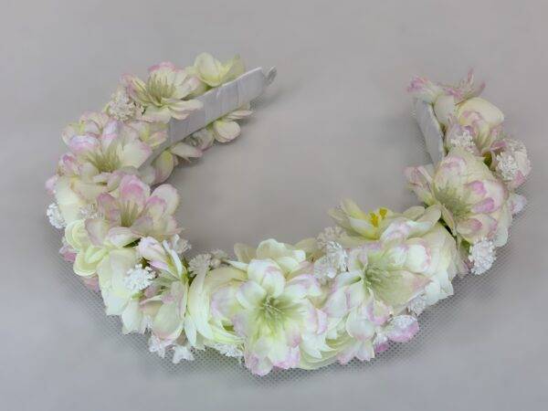 Wykonana z małych, delikatnych kwiatuszków w białym kolorze z delikatnym dodatkiem różowego.