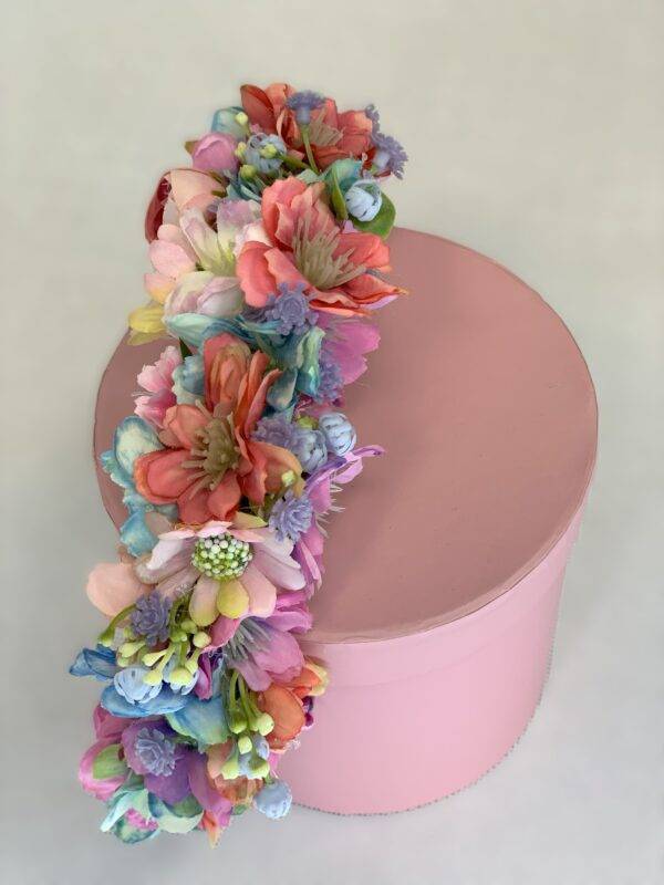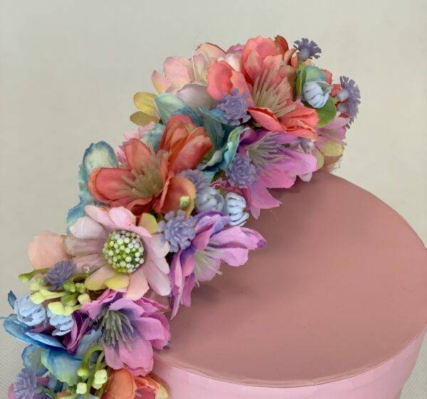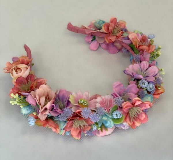 Wykonana z małych, delikatnych kwiatuszków w odcieniach różu i niebieskiego.