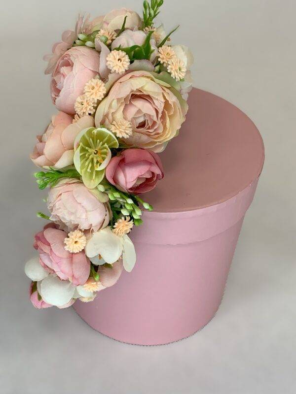 Wykonana z małych, delikatnych kwiatuszków w odcieniach różu i kremowego.