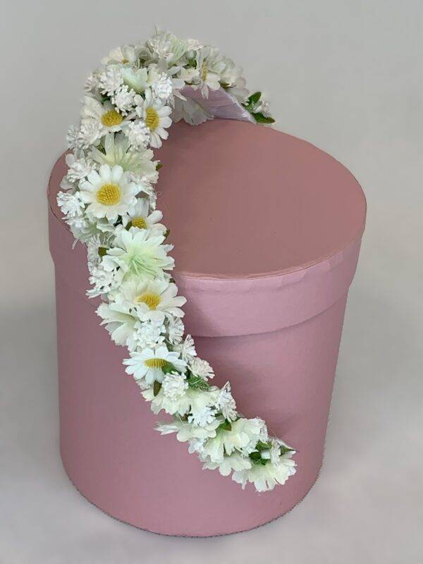 Wykonana z małych, delikatnych kwiatuszków rumianku, kaszki gipsówki w białym kolorze.