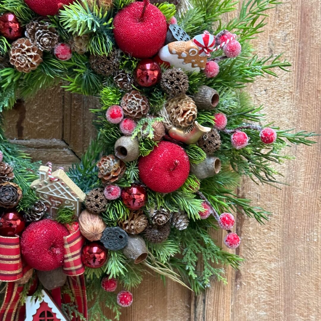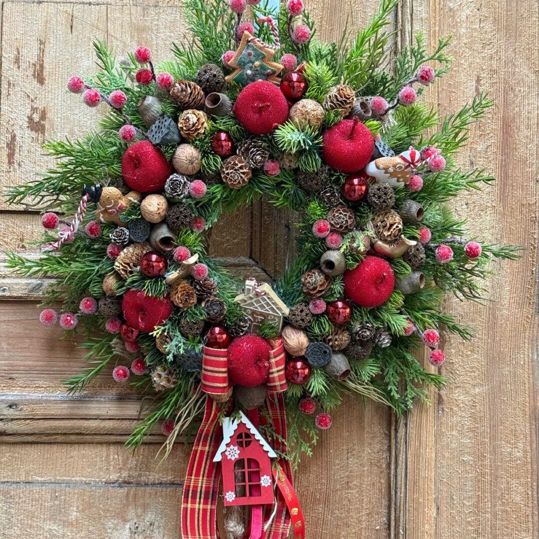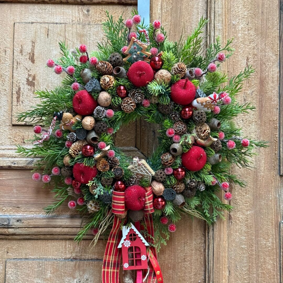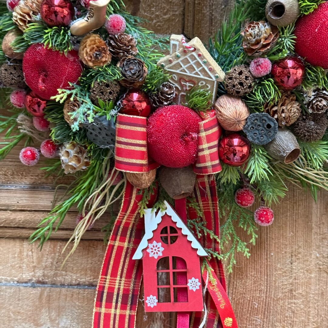 Wianek wykonany ze sztucznych świerkowych gałązek.