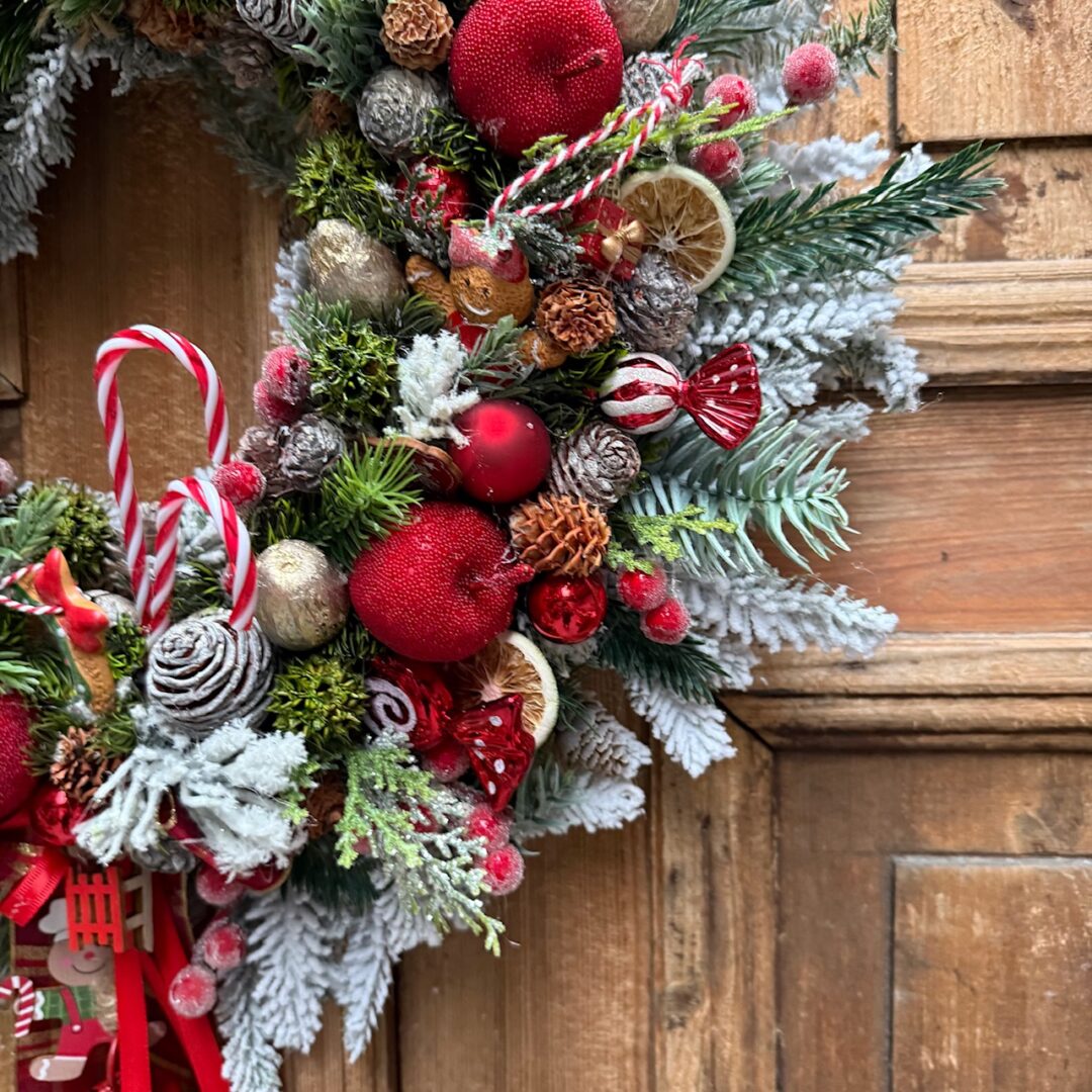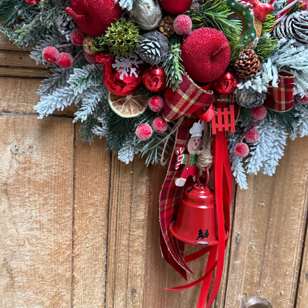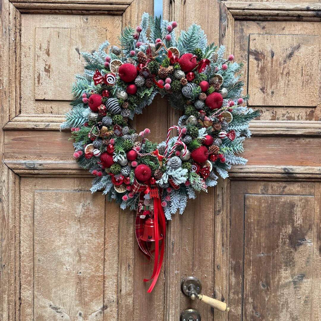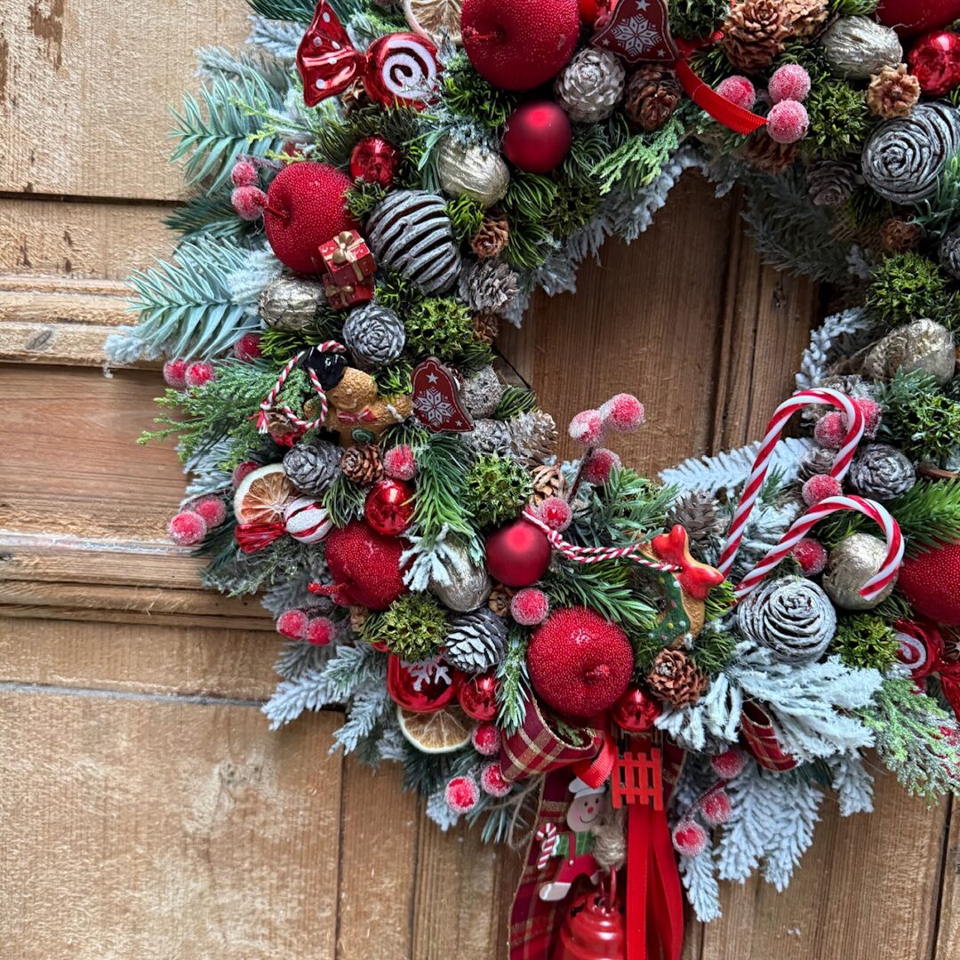 Wianek wykonany ze sztucznych świerkowych gałązek.