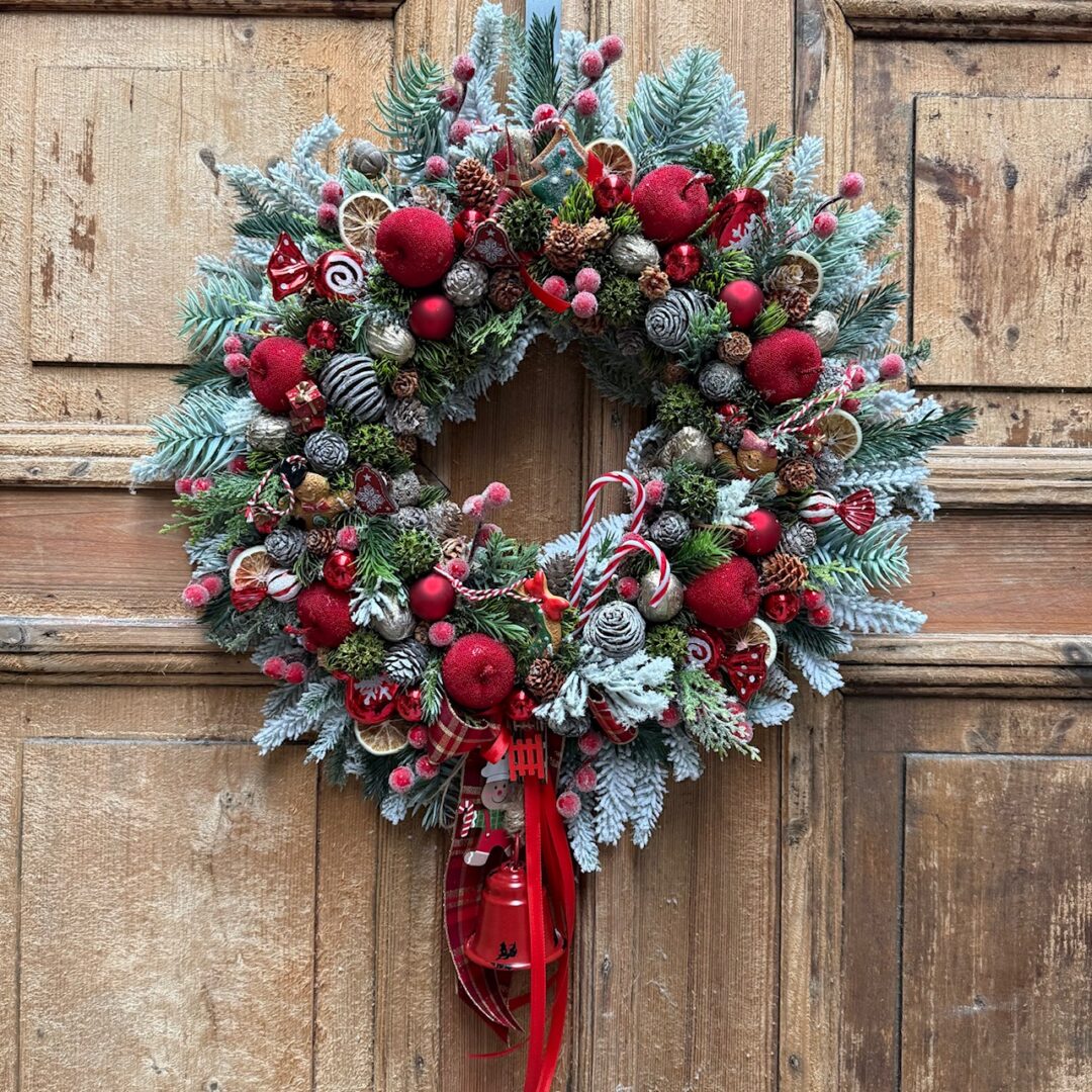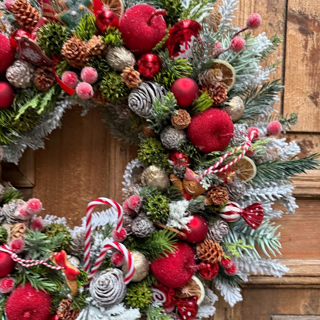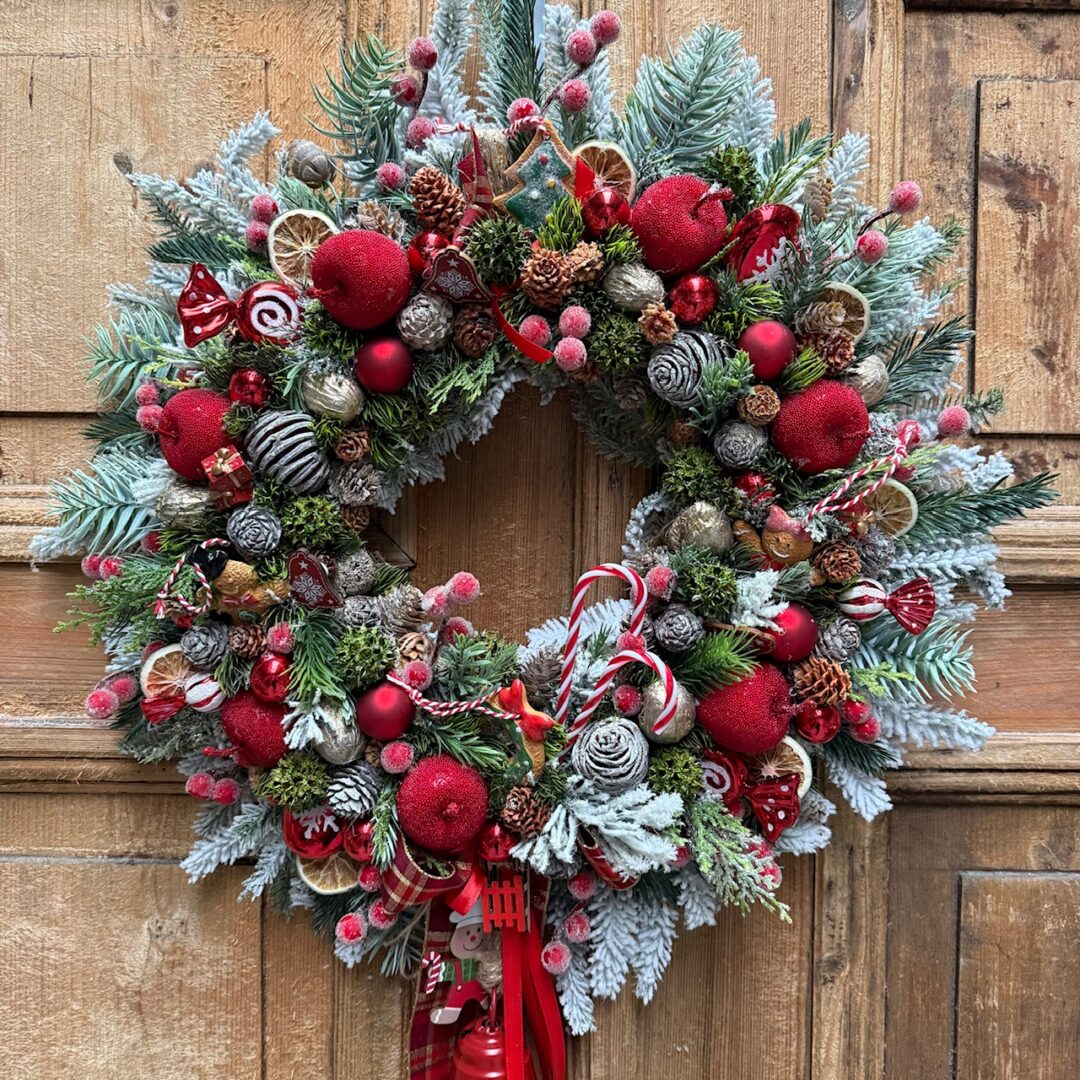 Wianek wykonany ze sztucznych świerkowych gałązek.