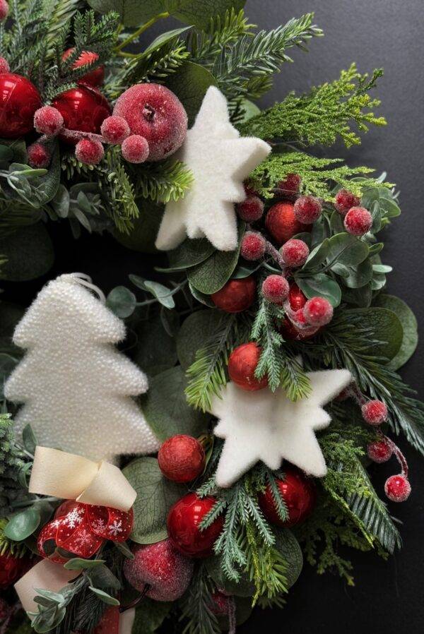 Wianek wykonany ze sztucznych świerkowych gałązek.