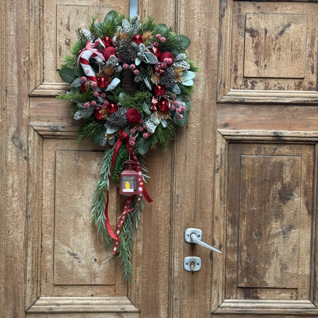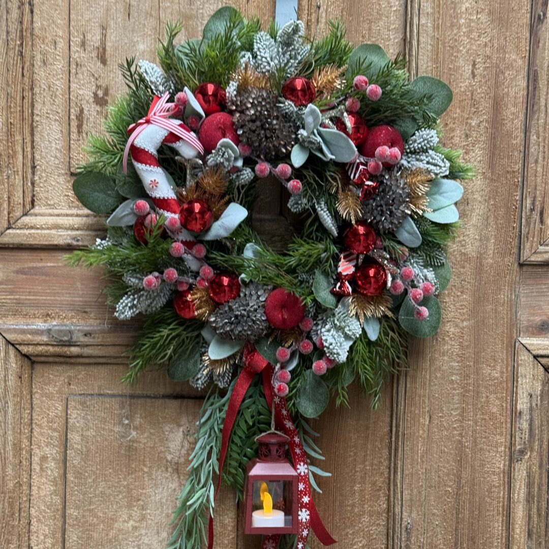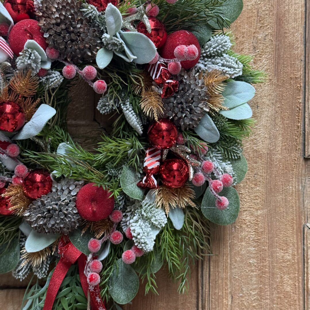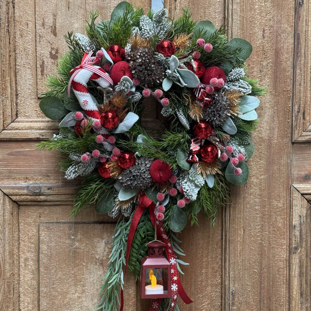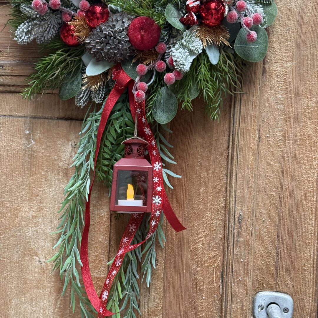 Wianek wykonany ze sztucznych świerkowych gałązek.