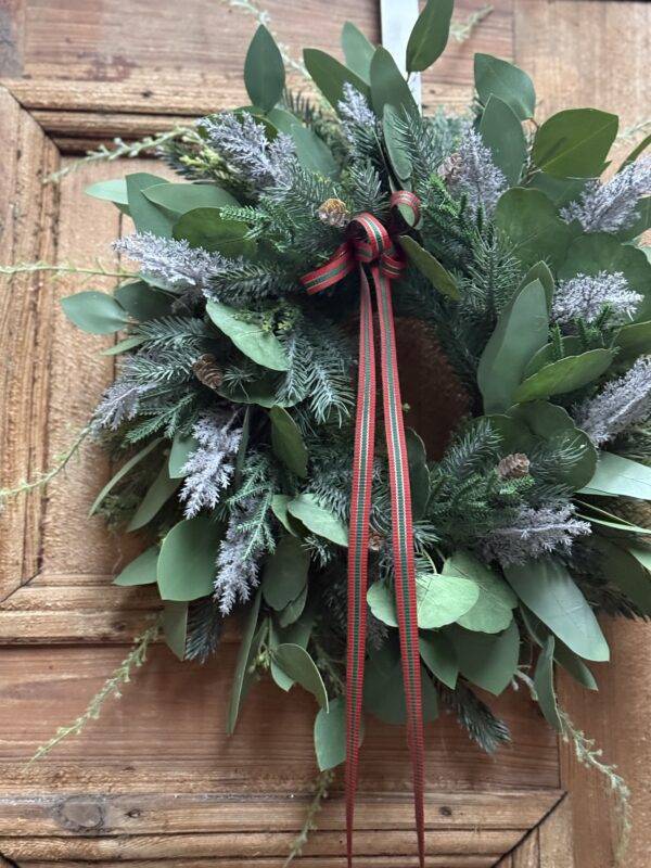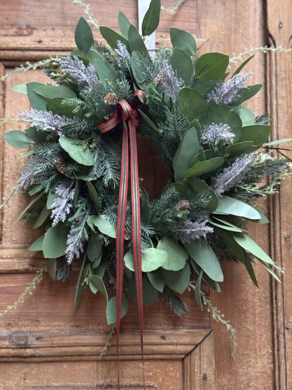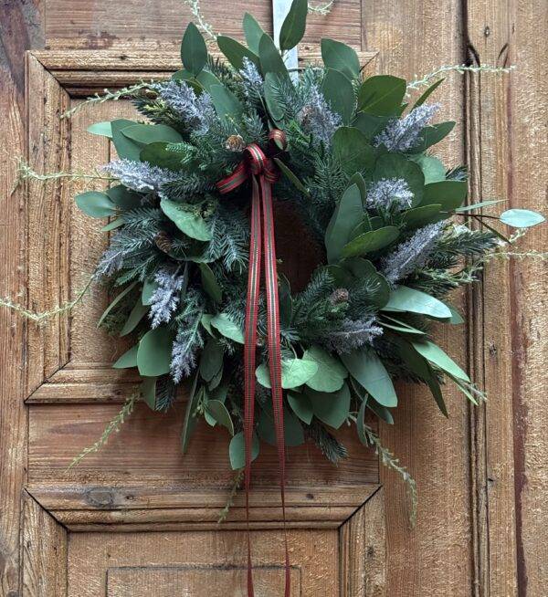 Wianek wykonany ze sztucznych świerkowych gałązek.