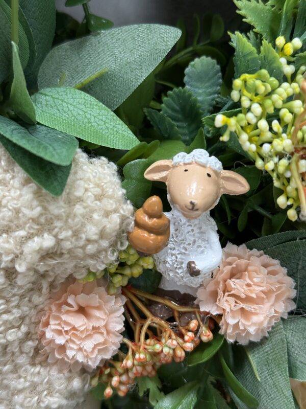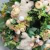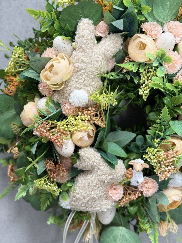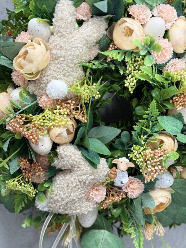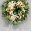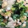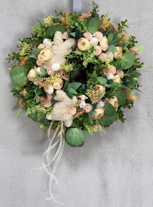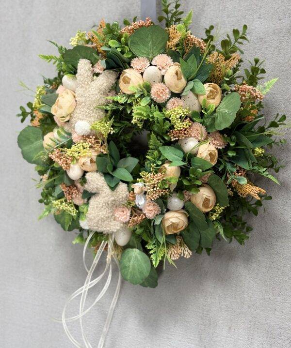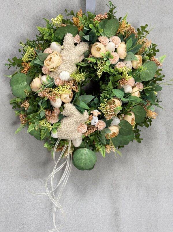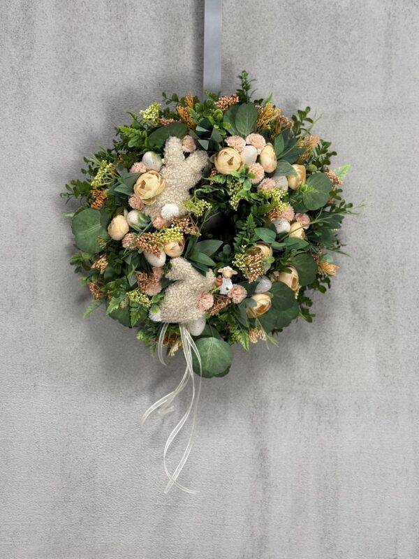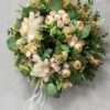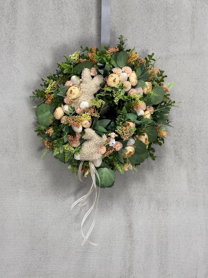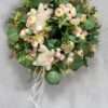 Wianek wykonany w całości ze sztucznych kwiatów i dodatków.