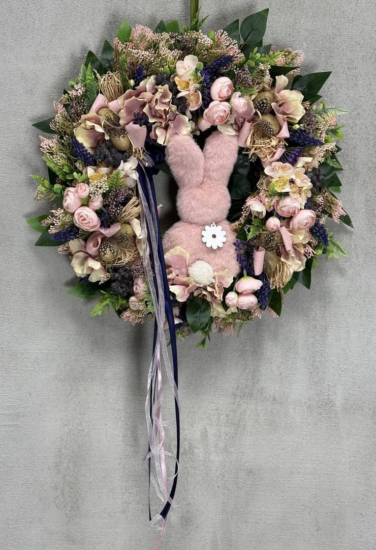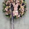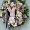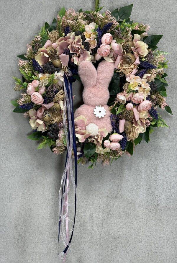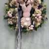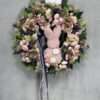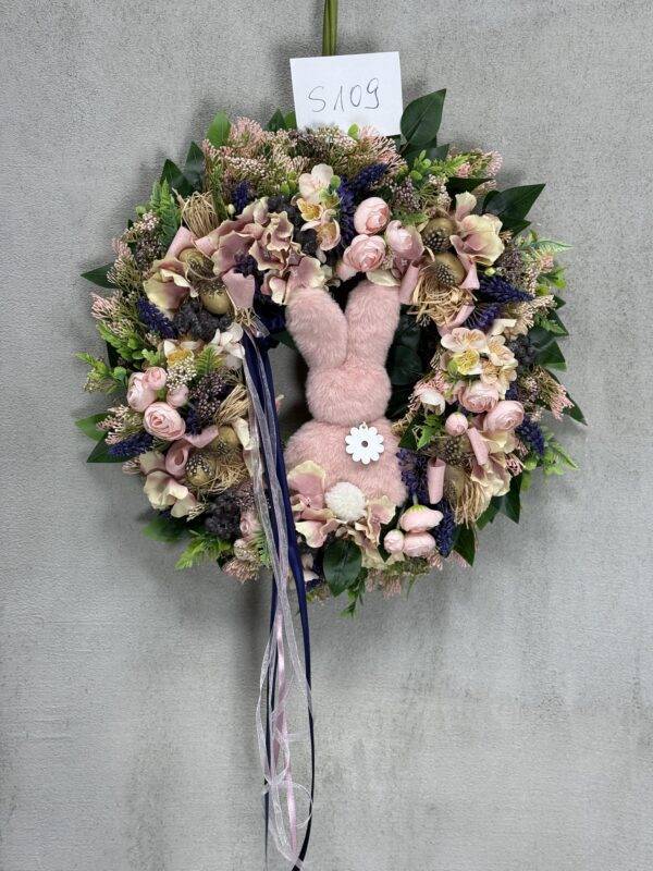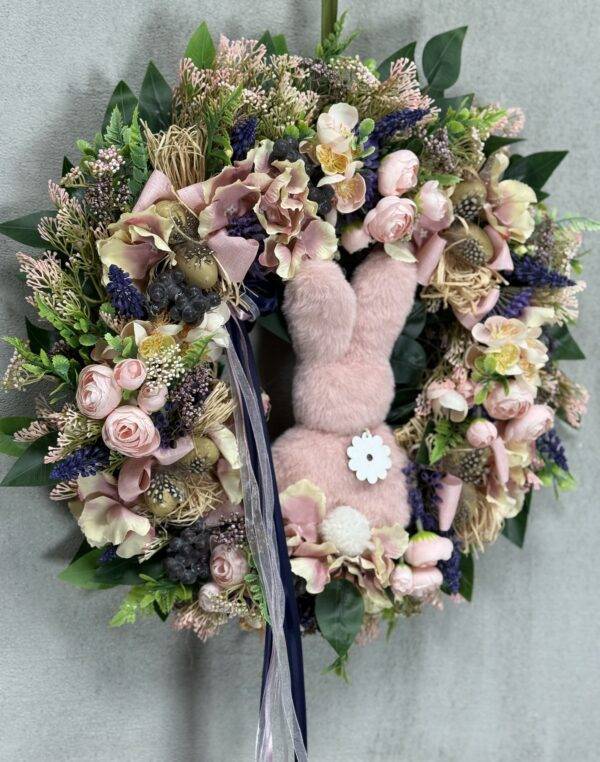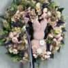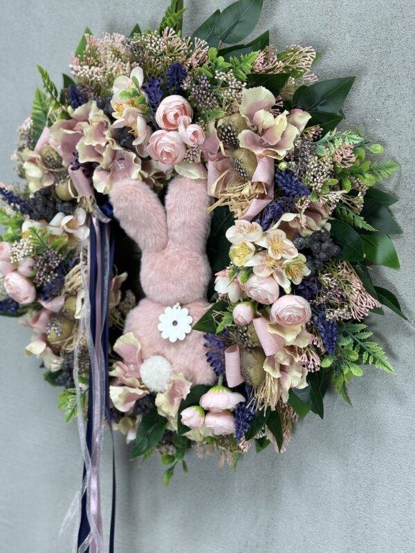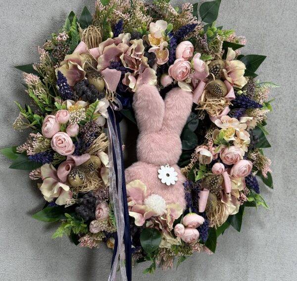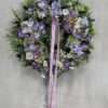 Wianek wykonany w całości ze sztucznych kwiatów i dodatków.