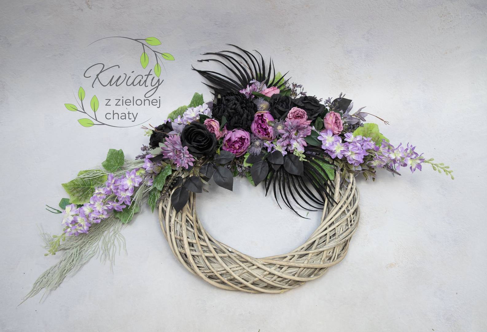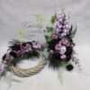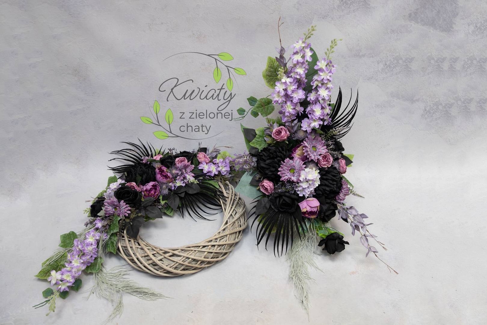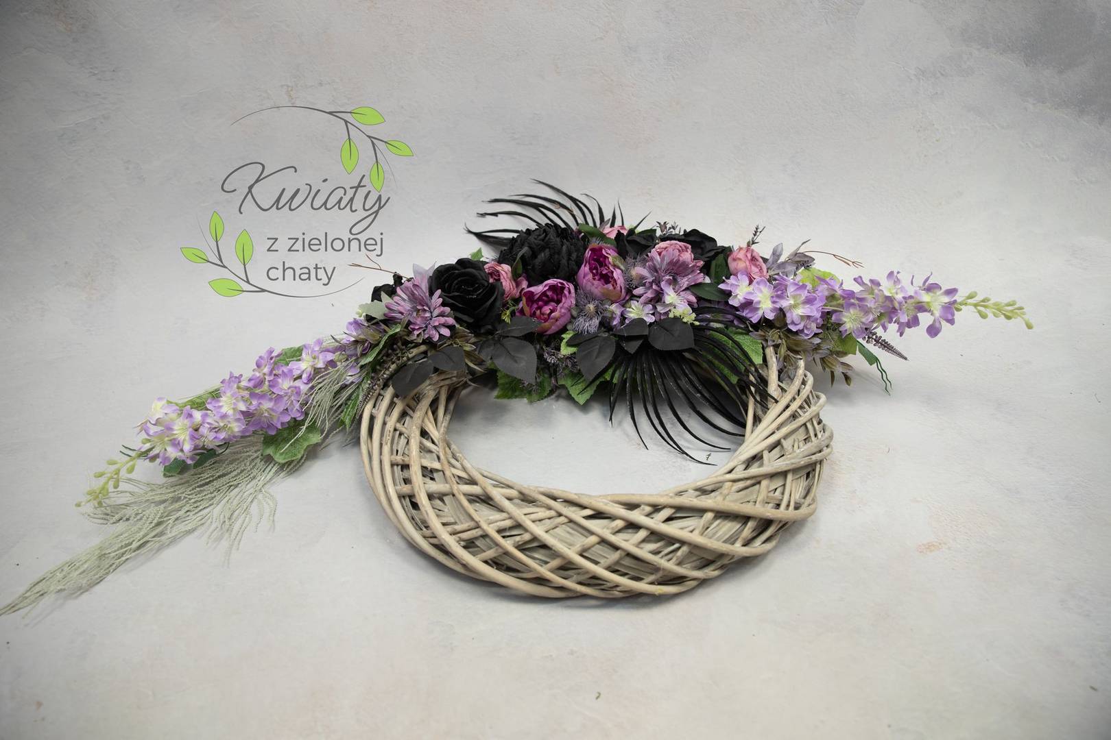 Elegancki komplet nagrobny na wiklinowym wianku w fioletowo-czarnej kolorystyce.