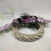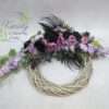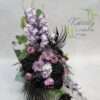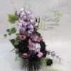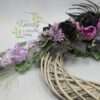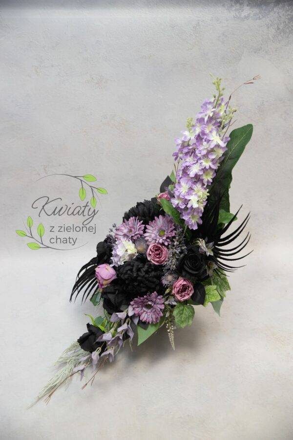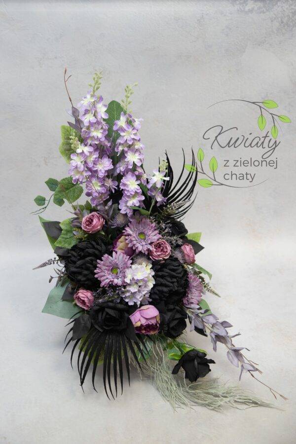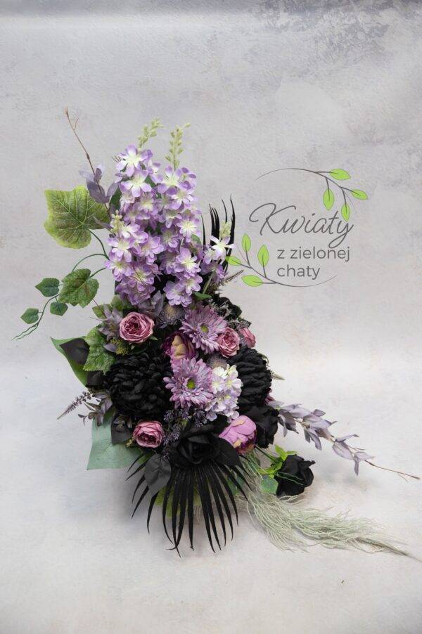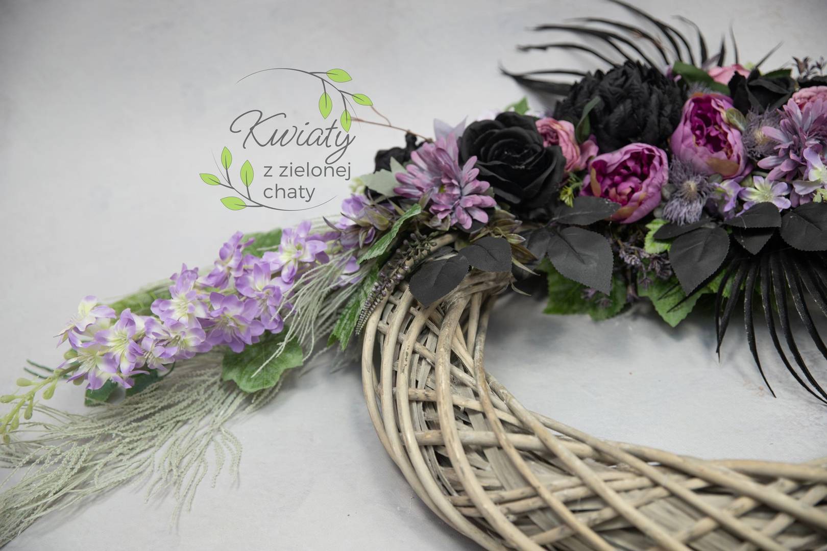 Elegancki komplet nagrobny na wiklinowym wianku w fioletowo-czarnej kolorystyce.