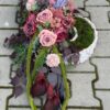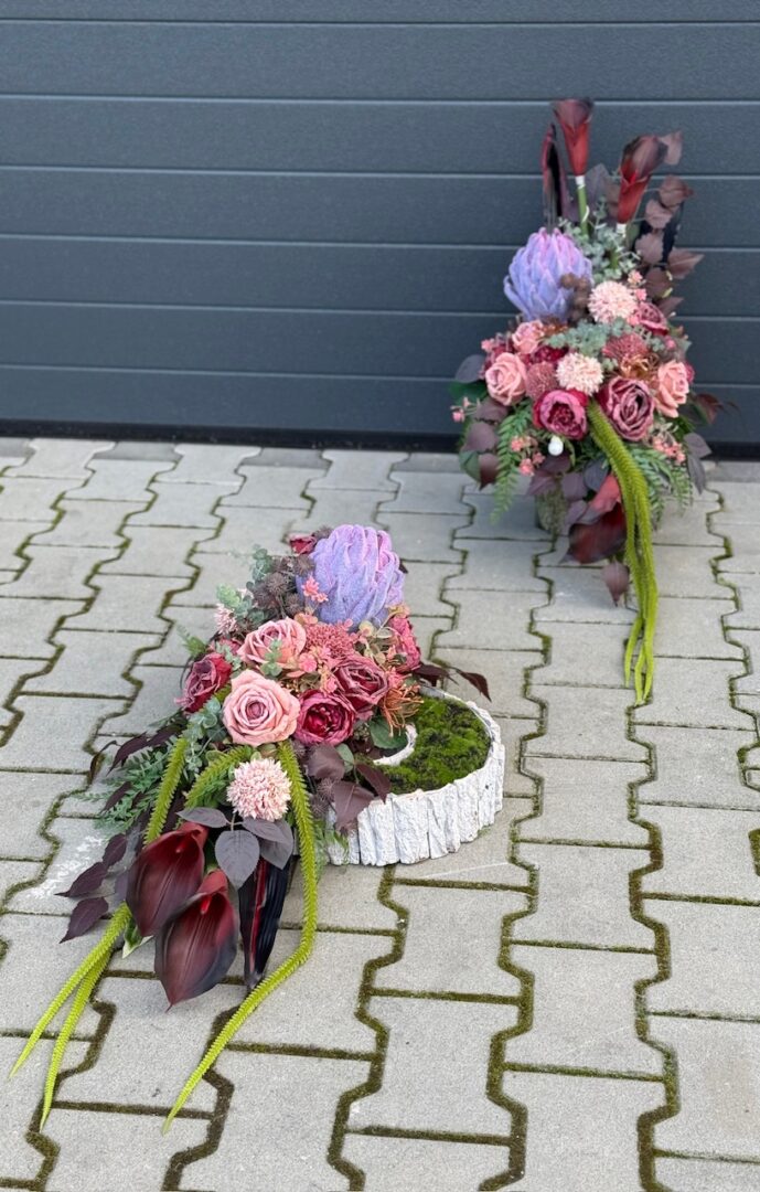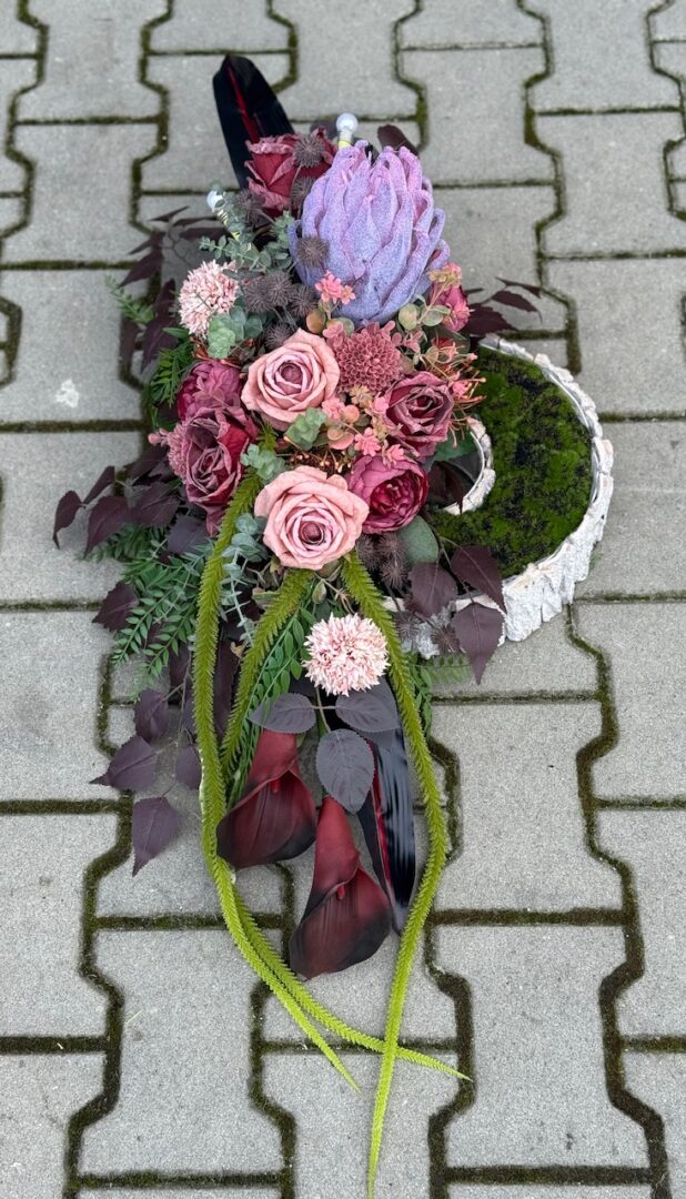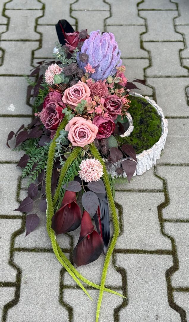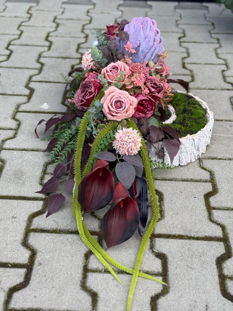Dekoracja do położenia na grób wykonana w obciążonym drewnianym pojemniku – długość około 90 cm, szerokość około 46 cm.