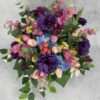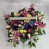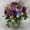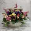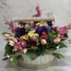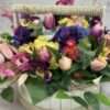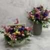 Bukiet na okrągło ułożony we wkładzie o standardowych wymiarach 16 cm – wysokość razem z wkładem około 45 cm, szerokość około 45 cm.