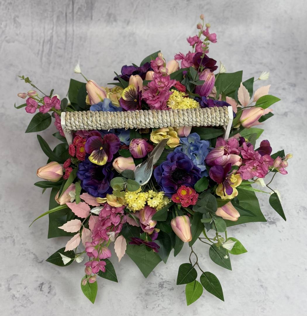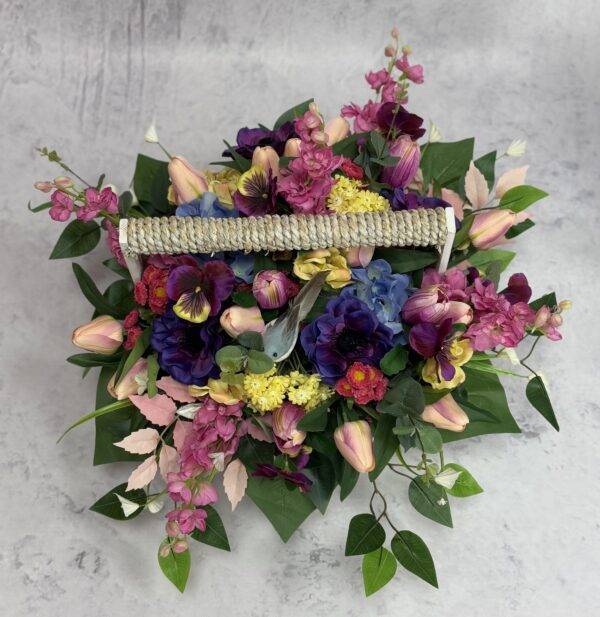 Dekoracja do położenia na grób w obciążonym wiklinowym koszu – szerokość około 50 cm, długości około 50 cm i wysokości około 32 cm.