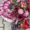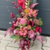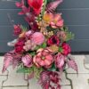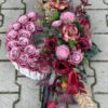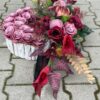 Bukiet ułożony we wkładzie o standardowych wymiarach 16 cm, wysokość razem z wkładem około 60 cm, szerokość około 40 cm.