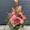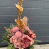 Bukiet ułożony we wkładzie o standardowych wymiarach 16 cm, wysokość razem z wkładem około 70 cm, szerokość około 40 cm.