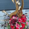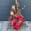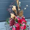 Bukiet ułożony we wkładzie o standardowych wymiarach 16 cm, wysokość razem z wkładem około 66 cm, szerokość około 40 cm.