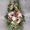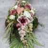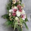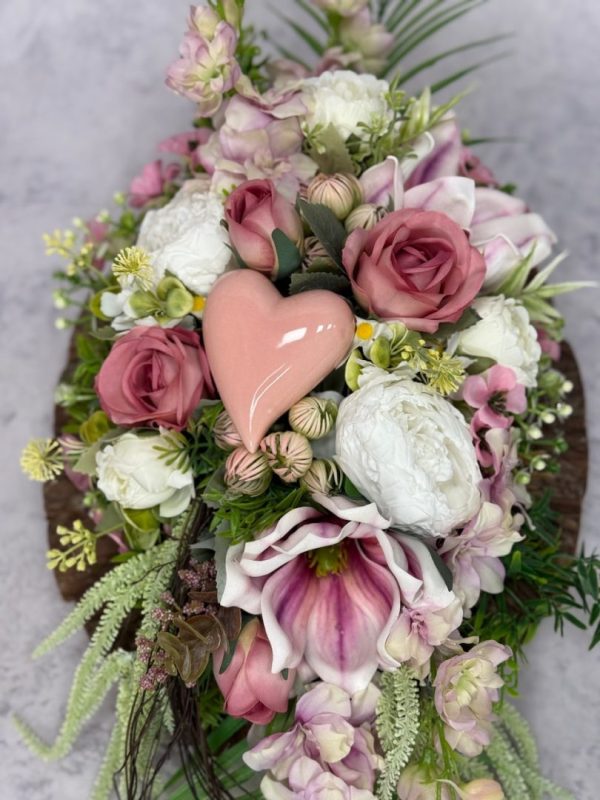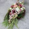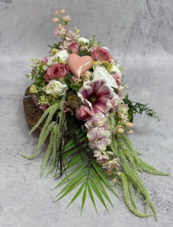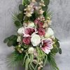 Dekoracja do położenia na grób wykonana w obciążonym drewnianym pojemniku – długość około 65 cm, szerokość około 30 cm.