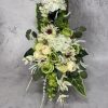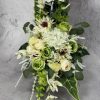 Dekoracja do położenia na grób wykonana w obciążonym drewnianym pojemniku – długość około 70 cm, szerokość około 40 cm, wysokość około 45 cm.