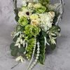 Bukiet na ułożony we wkładzie o standardowych wymiarach 16 cm – wysokość razem z wkładem około 58 cm, szerokość około 42 cm.