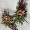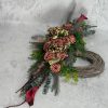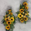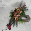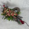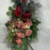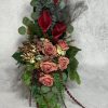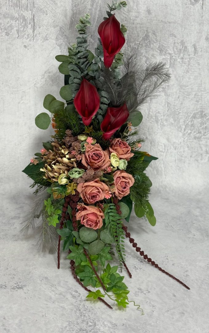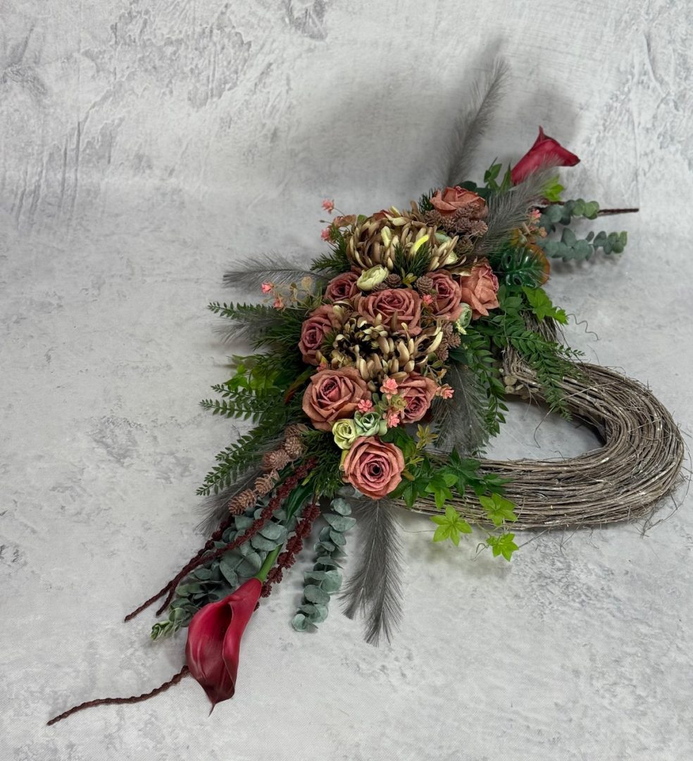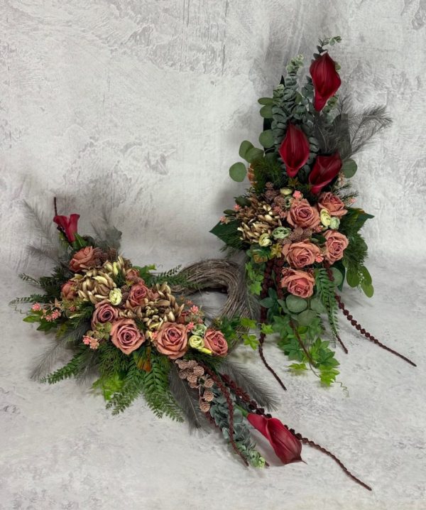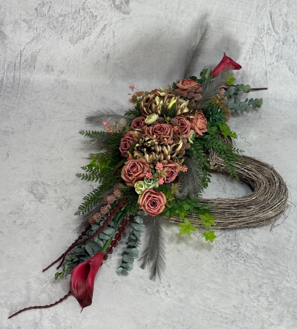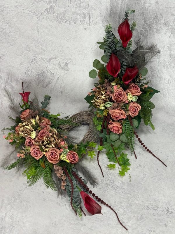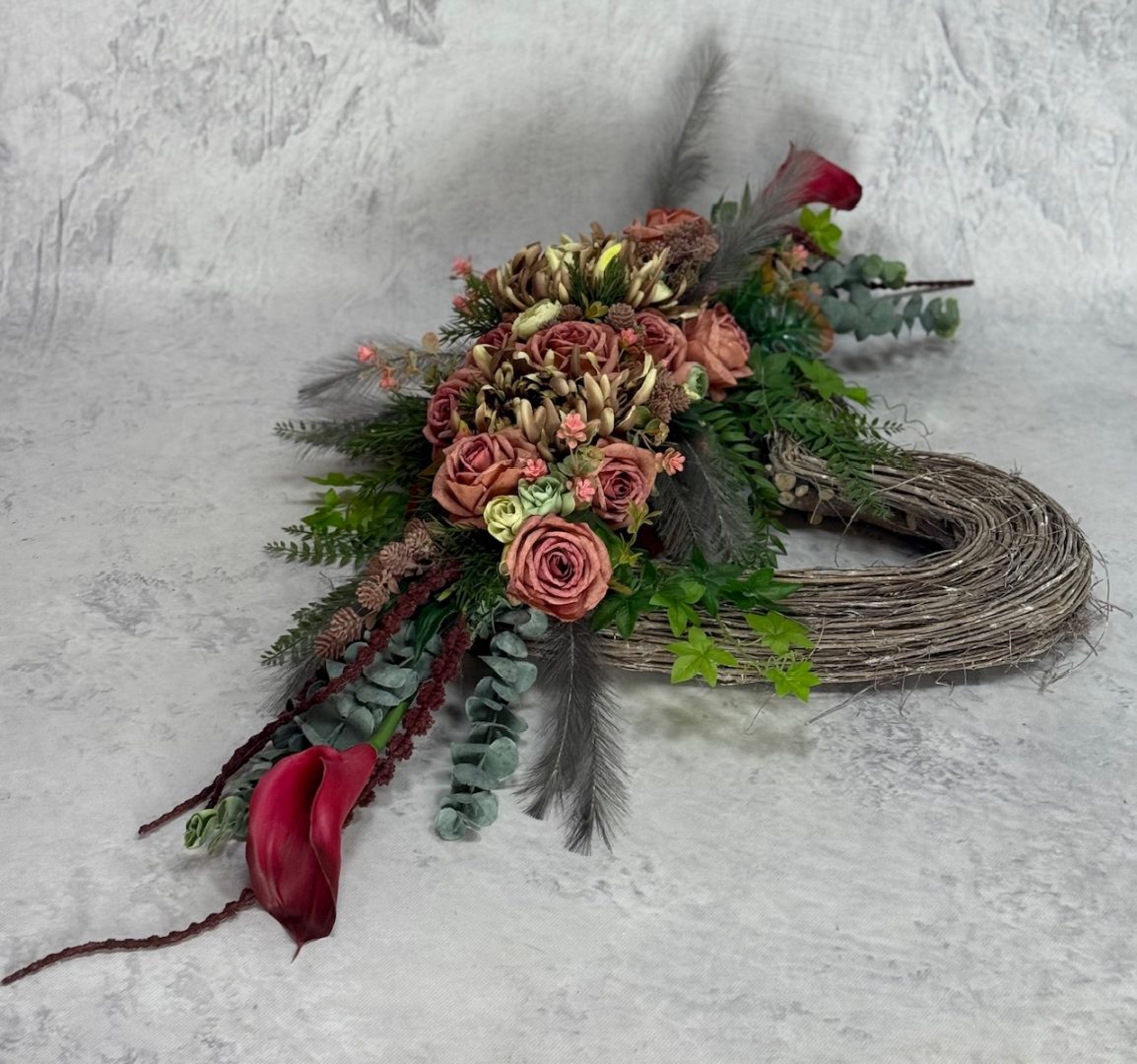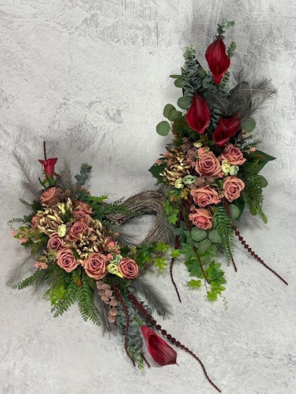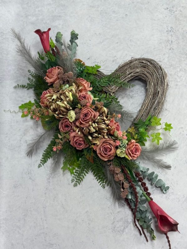 Dekoracja do położenia na grób wykonana na wiklinowym sercu – długość około 100 cm, szerokość około 60 cm.