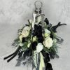 Dekoracja do położenia na grób wykonana w srebrnej latarni – długość około 100 cm, szerokość około 65 cm, wysokość około 50 cm.