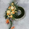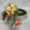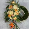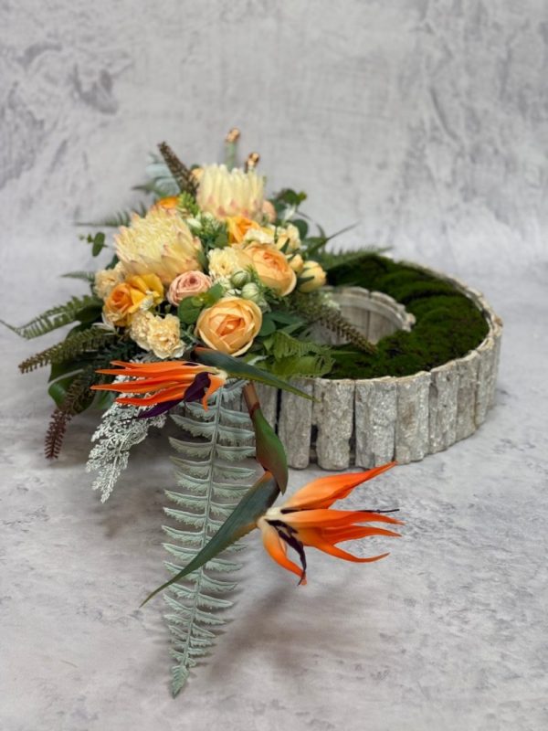 Dekoracja do położenia na grób wykonana w obciążonym drewnianym pojemniku – długość około 95 cm, szerokość około 50 cm.