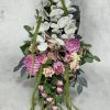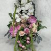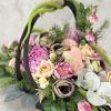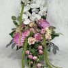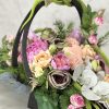 Bukiet ułożony we wkładzie o standardowych wymiarach 16 cm, wysokość razem z wkładem około 65 cm, szerokość około 48 cm.