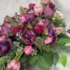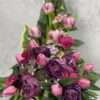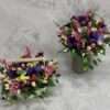 Bukiet ułożony we wkładzie o standardowych wymiarach 16 cm – wysokość razem z wkładem około 60 cm, szerokość około 43 cm.