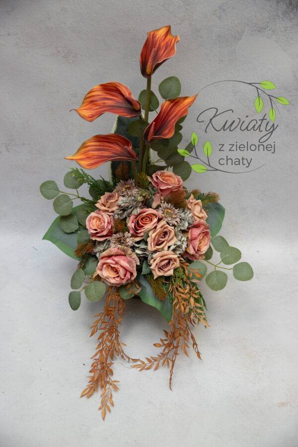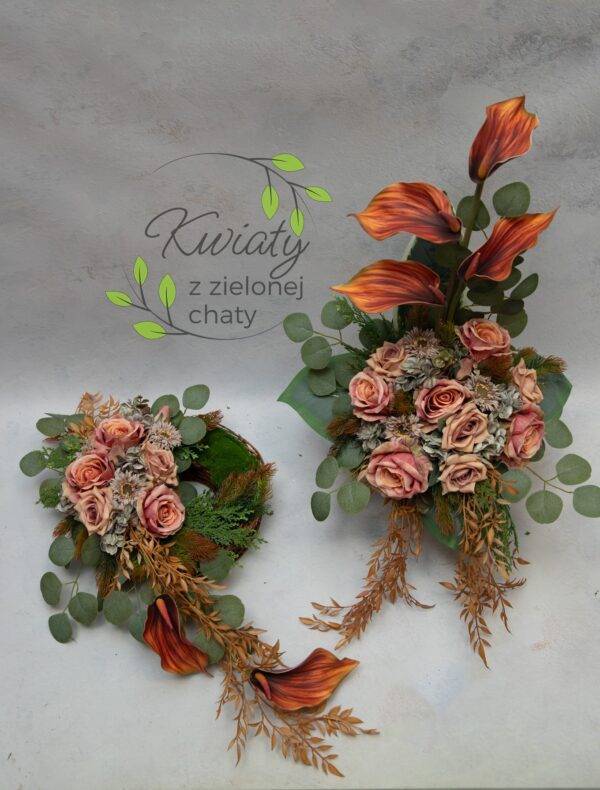 Komplet nagrobny wiklinowy pojemnik z kwiatami w jesiennych kolorach.