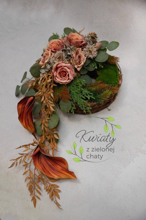 Dekoracja do położenia na grób w wiklinowym pojemniku o średnicy około 30 cm i długości z wszystkimi wystającymi elementami około 72 cm.