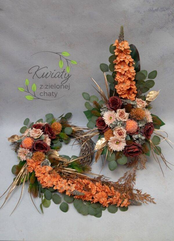 Komplet nagrobny z wiklinowym wiankiem, ostróżką i ze złotymi dodatkami.