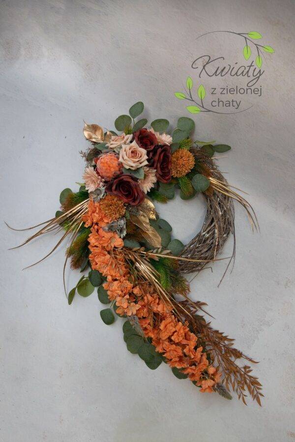 Dekoracja do położenia na wiklinowym wianku o średnicy około 39 cm i długości z wszystkimi wystającymi elementami 92 cm.