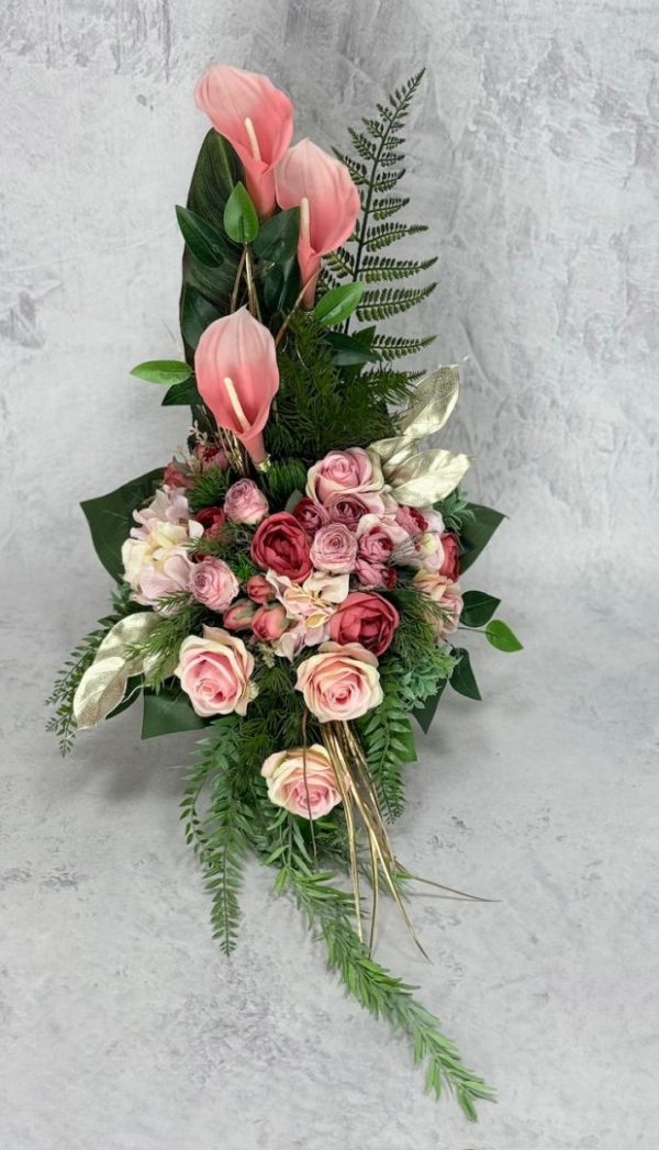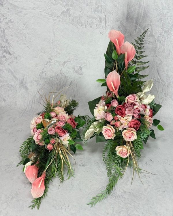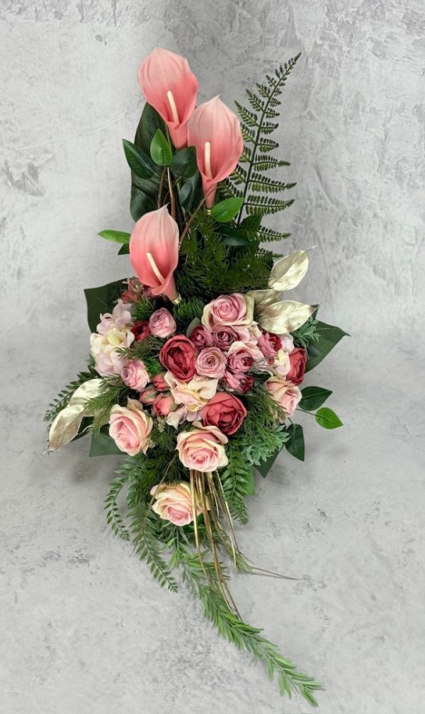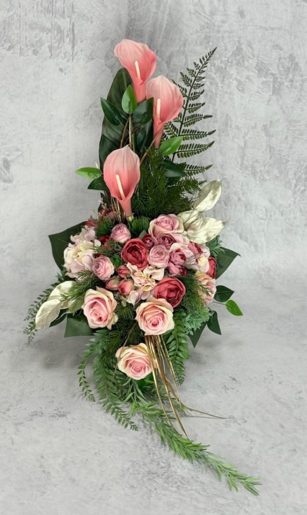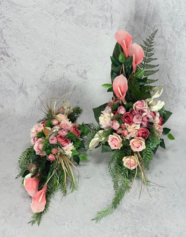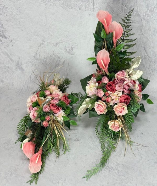 Elegancki komplet nagrobny w pięknych kolorach – odcieniach różu. Do skomponowania dekoracji nagrobnej zostały użyte kalie, róże, pełniki, hortensje i sztuczne dodatki bardzo dobrej jakości.