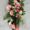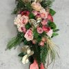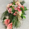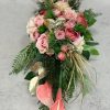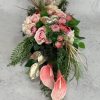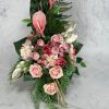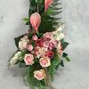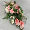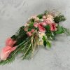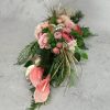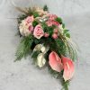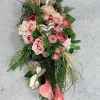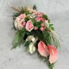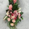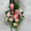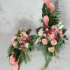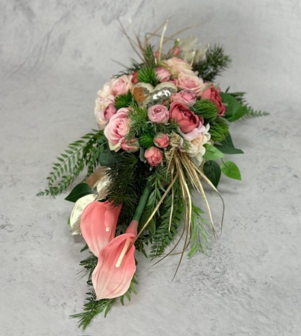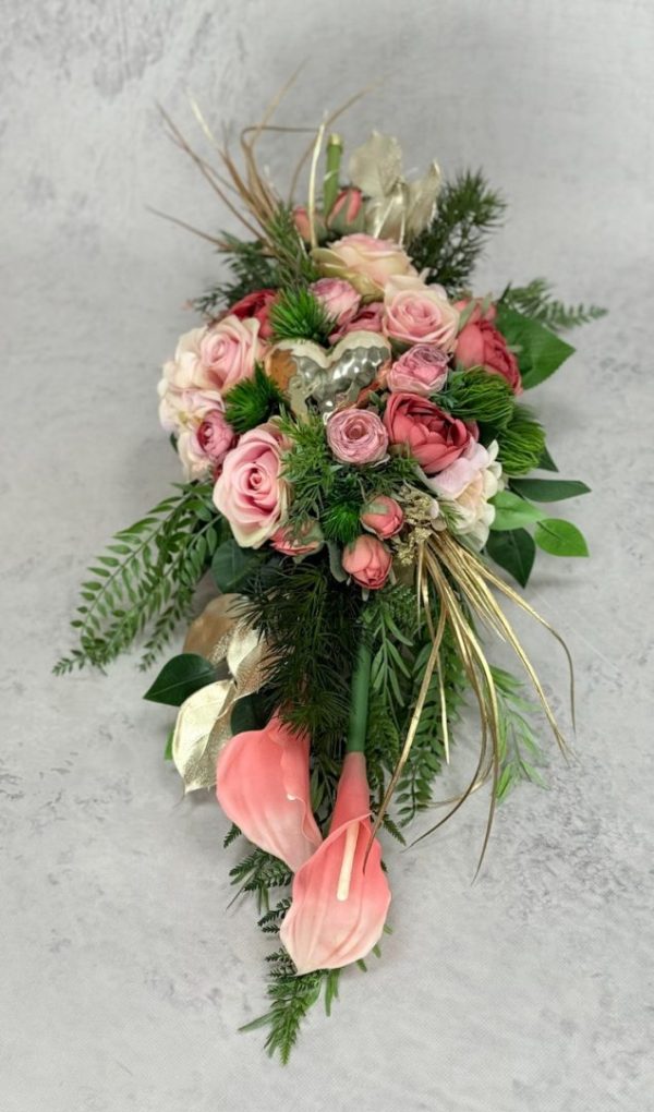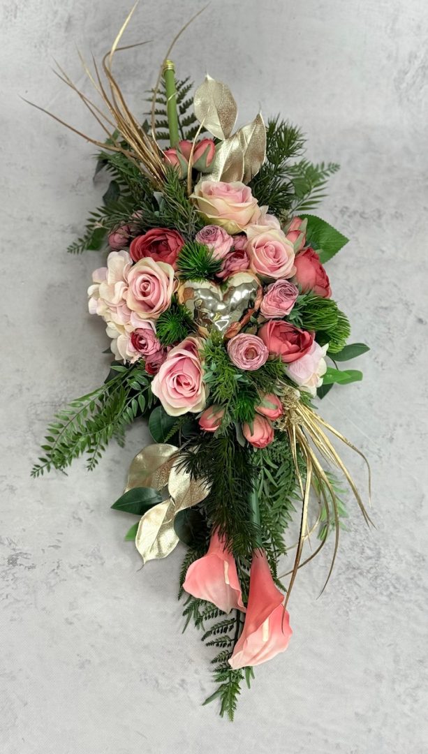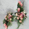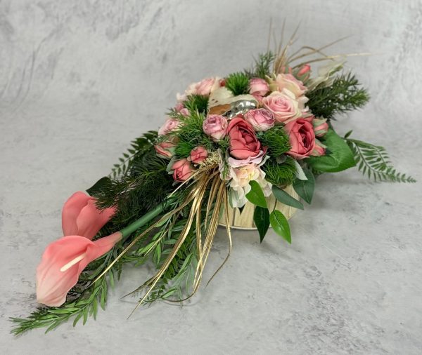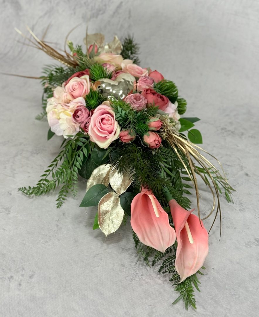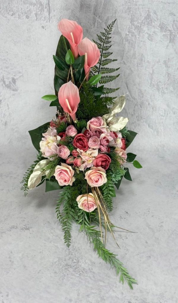 Elegancki komplet nagrobny w pięknych kolorach – odcieniach różu. Do skomponowania dekoracji nagrobnej zostały użyte kalie, róże, pełniki, hortensje i sztuczne dodatki bardzo dobrej jakości.