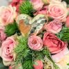 Bukiet ułożony we wkładzie o standardowych wymiarach 16 cm, wysokość około 65 cm, szerokość około 45 cm.