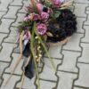Dekoracja do położenia wykonana w obciążonym pojemniku. Kompozycja o długość około 100 cm, szerokość około 50 cm.